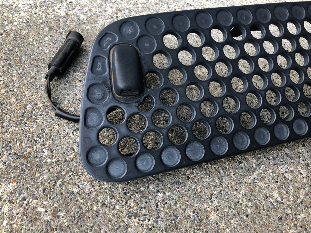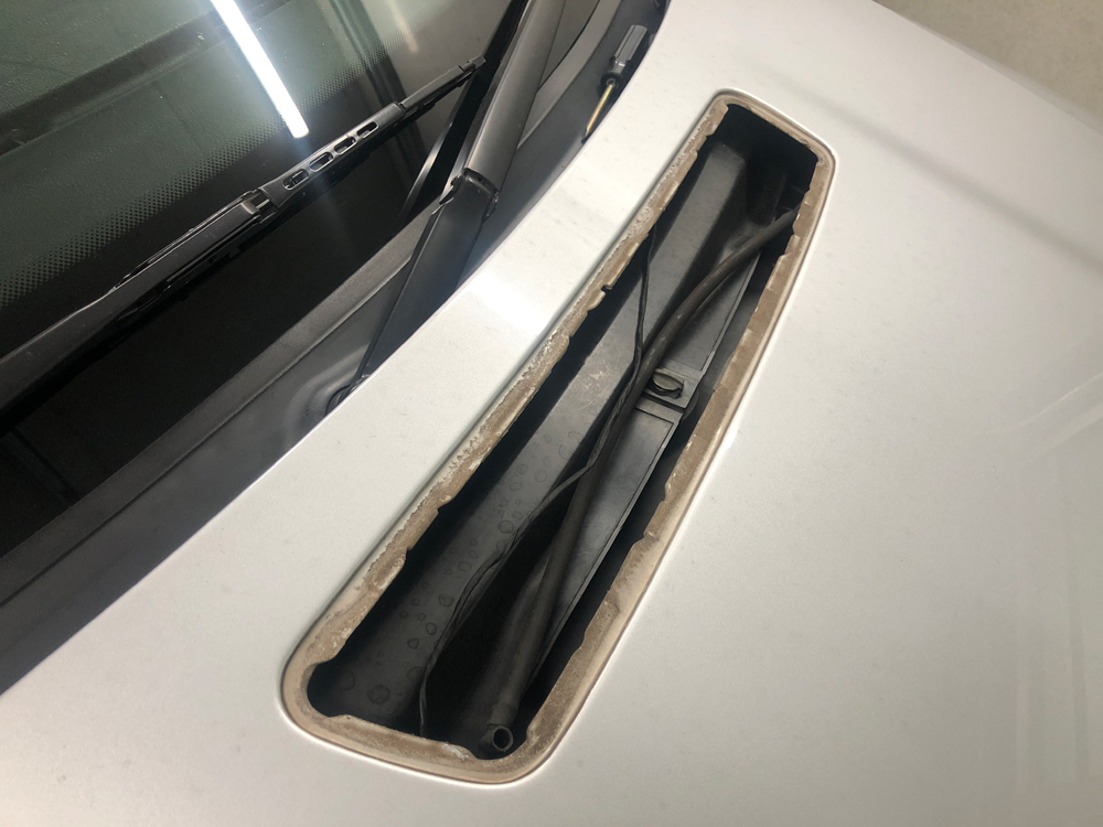 いきなりですが、上記の写真はボンネットからグリルを外した状態。取り外しは左右のウィンドウウォッシャー噴出し口の電磁バルブのハーネスとウィンドウオッシャータンクに繋がるホースが電磁弁に刺さっているので抜き、あとはボンネットに爪でグリルが固定されているので、爪を丁寧に外していくだけで簡単に取り外しが行えます。