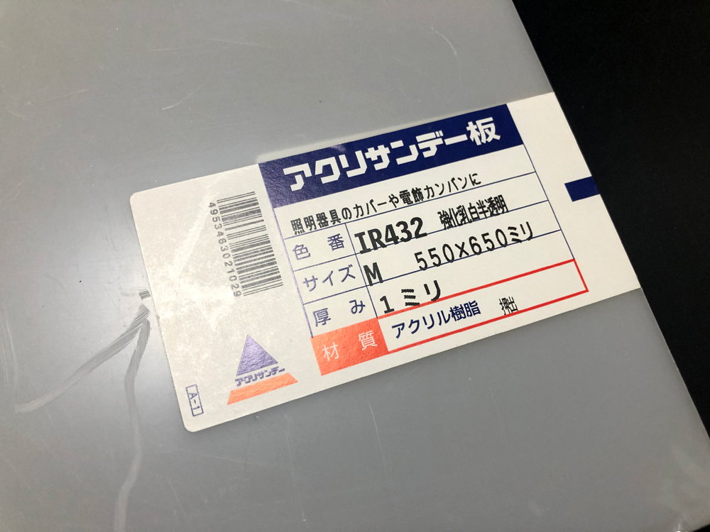 アクリサンデー板の保護フィルムはなるべく最後まで剥がさないように(傷をつけたくない)不要な部分を切り落としました。