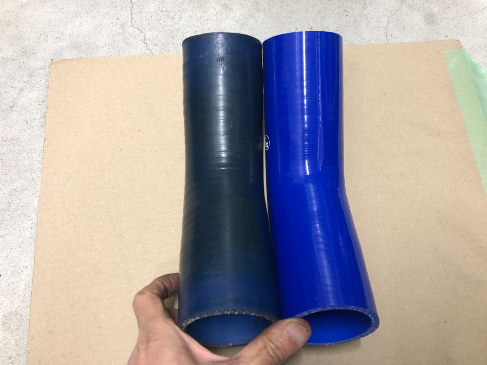 取り外したシリコンホースの形状は60mm45℃のエルボーホースなのですが、長さが片側125mmでネットで簡単に手に入る60mm、45°のエルボーホースは殆どの長さが方が90mmしかありませんでした。仕方がないのでSamco製を扱っている平野タイヤさんにネットで注文。Samcoのシリコンホースは簡単には入手出来ないんですね…今回初めて知りました。