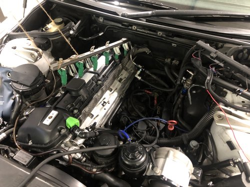 インマニ、正確にはアダプタの問題個所の修復が完了したのでインマニの取付作業に入りました。1人での作業なのでインマニ取付前にインジェクターレールを紐で釣ったり、邪魔な配線をどかしたり、接続する負圧ホースや取り付けるハーネスの配線位置の確認を行いました。インジェクターハーネスレールから出ている水温センサーのハーネスはこの段階で取り付けておきました。