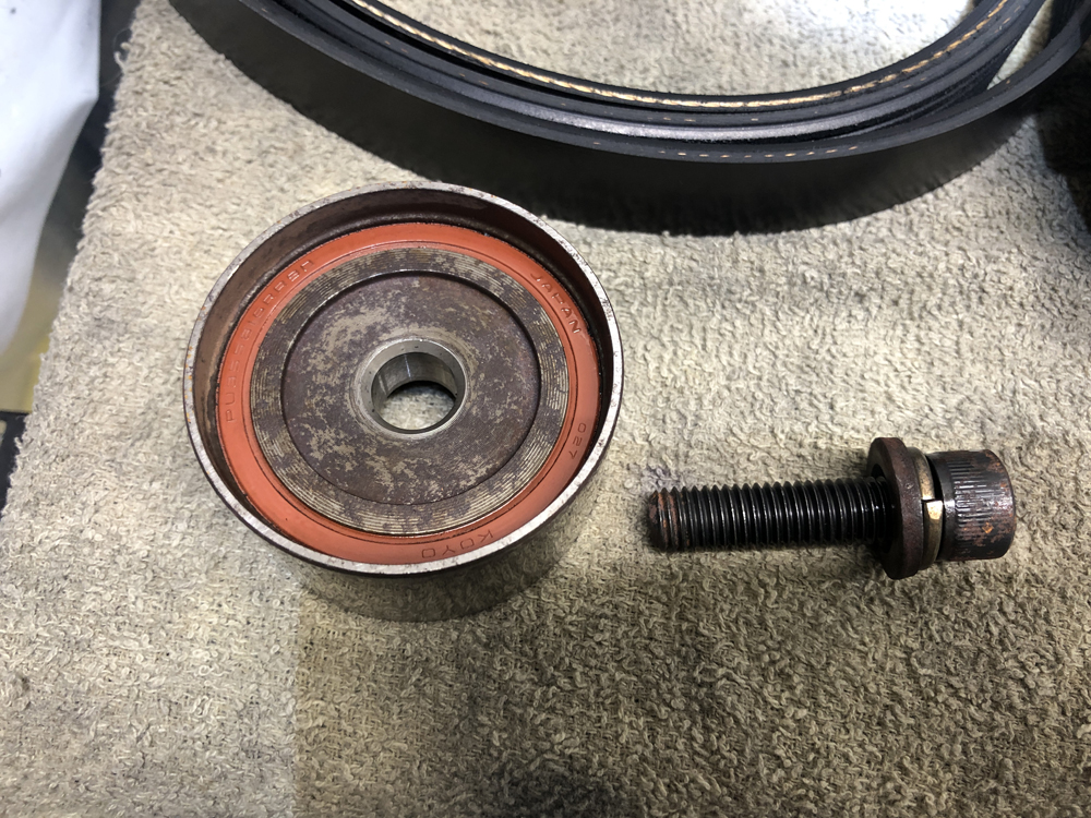 当方の車両はスーパーチャージャー用に2つのアイドルプーラーがあり、ベルトの脱着には1つアイドルプーラーを取り外しが必要。前回新品に交換したアイドルプーラーも一応サビ落としをしてみましたが上記の状態でサビサビ。新品へ交換時の写真と比較するとかなりサビサビですね。アイドルプーラを固定するM10のボルトは24Nmで締め付けしました。