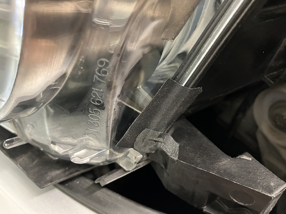 内部の水分を拭き取ってからライトカバーを元に戻して水の侵入経路を探してみたところ、上記の部分の突起物破損しておりライトカバーとパッキンに少し隙間が出来ていました。(上側の突起物が破損している)ライトカバー正面から見て右下方向を中心に曇っているので、この部分からの水分、冷たい走行風などの侵入で間違いなさそうです。取り急ぎの対策としてそんなに頻繁にライトカバーは脱着しませんので、アセテートテープを貼って対策してみました。