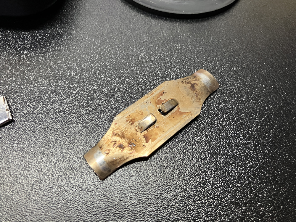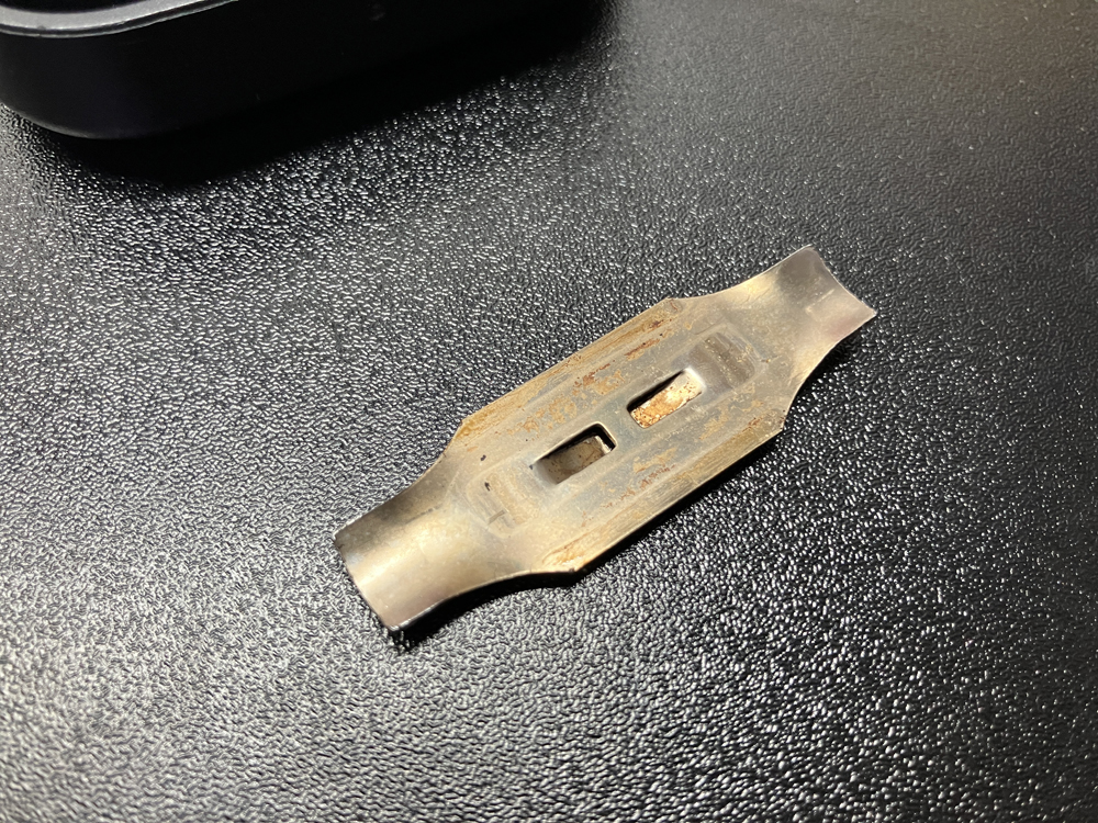 オイルフィラーキャップから取り外した金属製の爪部分です。上記の写真からもわかるように内部の爪を左右からひっかける事でオイルフィラーキャップ本体に固定されています。結構汚れていたのでパーツクリーナーで洗浄しました。写真からもわかるようにエンジンヘッドカバー側にひっかける部分(押さえている部分)が剥げてます。