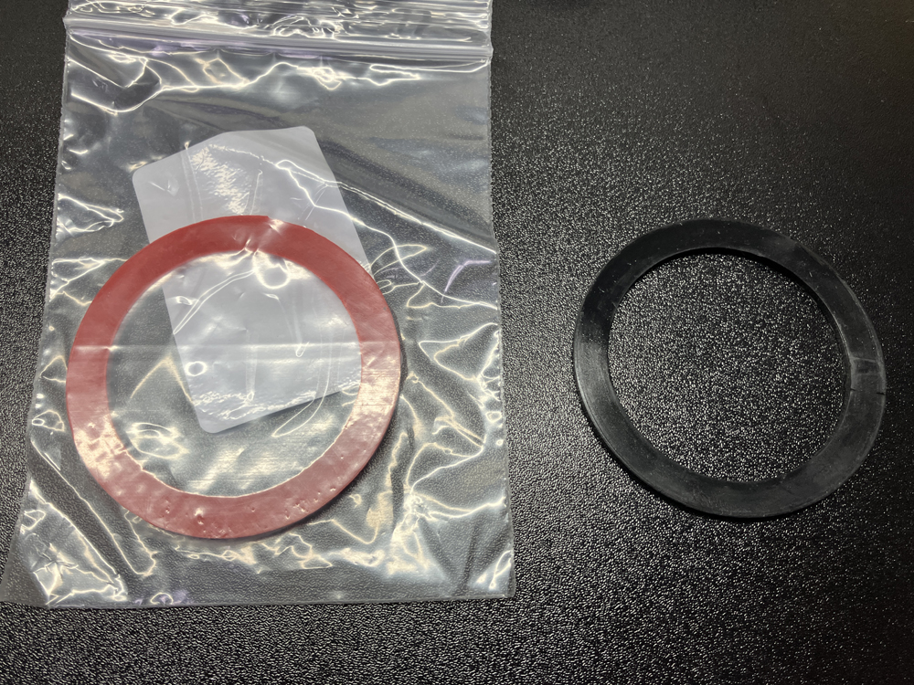 重ねてみると新規購入した方が少し大きめに見えます。取り外したゴムパッキンは硬化が進んでいるので多少縮んだみたい。