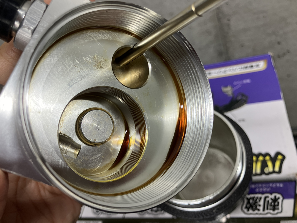 続いてオイルキャッチタンク内部の確認。何も溜まっていませんでした。夏場は水分は殆どたまらないので前回と同様でした。オイル添加剤やフラッシングを繰り返し行い、一時期酷かったブローバイガスに含まれるオイル量は激減。ということはブローバイガスの量が減ったという認識でいいんですかね?