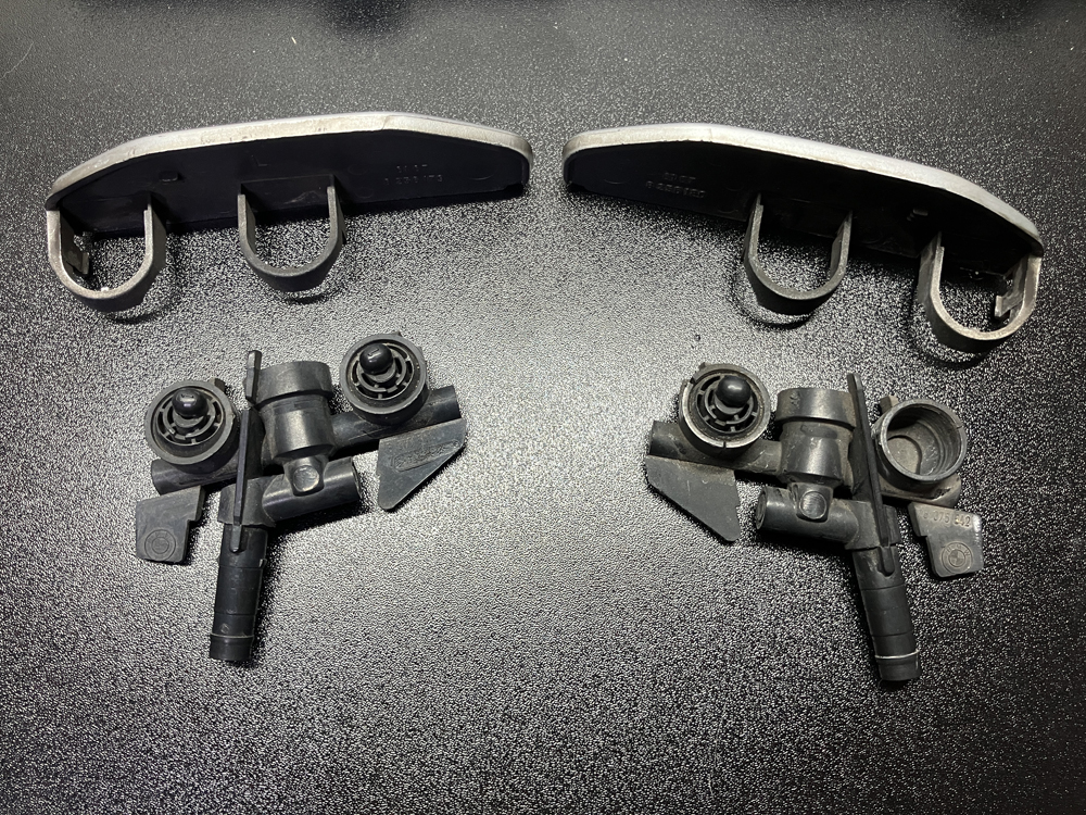 上記の写真を見てもらうとわかるのですが、右側の右ノズル部分を紛失してしまい、この部分がないだけでウィンドウウォッシャー液が漏れてきてしまいます。特にライトウィンドウウォッシャーは必要としないので撤去した際に、アイリッド部分のウィンドウウォッシャー噴出口は簡易対策でタイラップで固定していました。