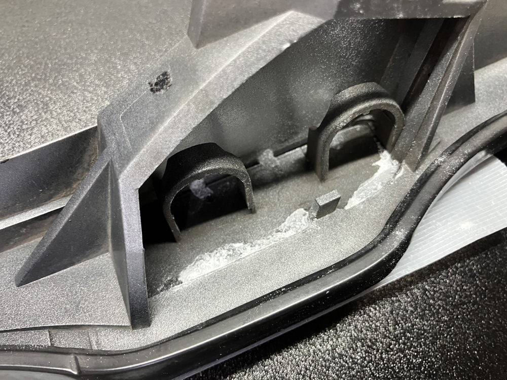 上記の写真を見るとわかるようにライトウィンドウウォッシャーのノズル部分を収納するためにアイリッドは2ピース構成になっています。左側は加工して吸気の取り込みに使うおうと思っていたのですが、吸気用に使用するには少し小さすぎると思い、今回穴を完全に埋めることにしました。