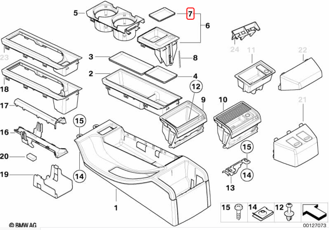 上記のE46のセンターコンソール部分のコインセレクターの手前にある小物入れスペースの下に敷いてある部分をキャップ(CAP)という呼ぶようです。当方の車両のキャップは数年前に加水分解して破損してしまったので上記の写真の用に何も敷いてありません。この部分に「そんなパーツあるのか?」なんて存在すらしらない人も多かったりするのかな?