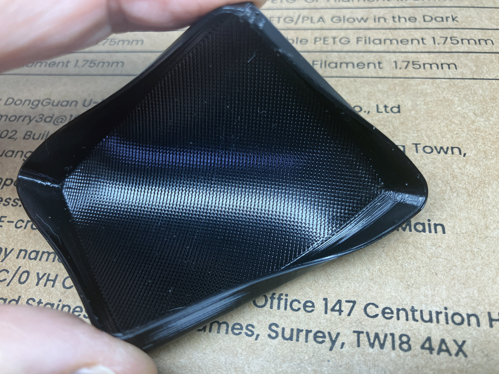ゴム素材なので上記のように曲げることが出来ます。耐熱・耐油・耐ガソリン性があるので3Dプリンターでゴム素材系のガスケットも作成できます。ちなみに今回使用したのフィラメントはTINMORRY社のTPU 95Aです。比較的硬度の高い素材になるのかな?