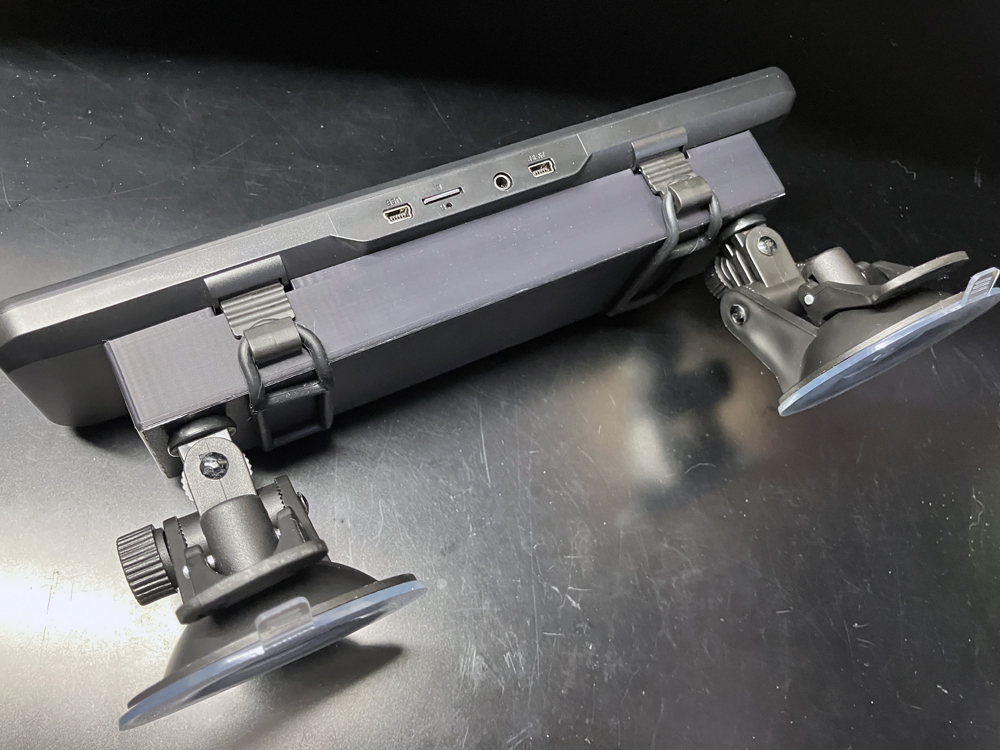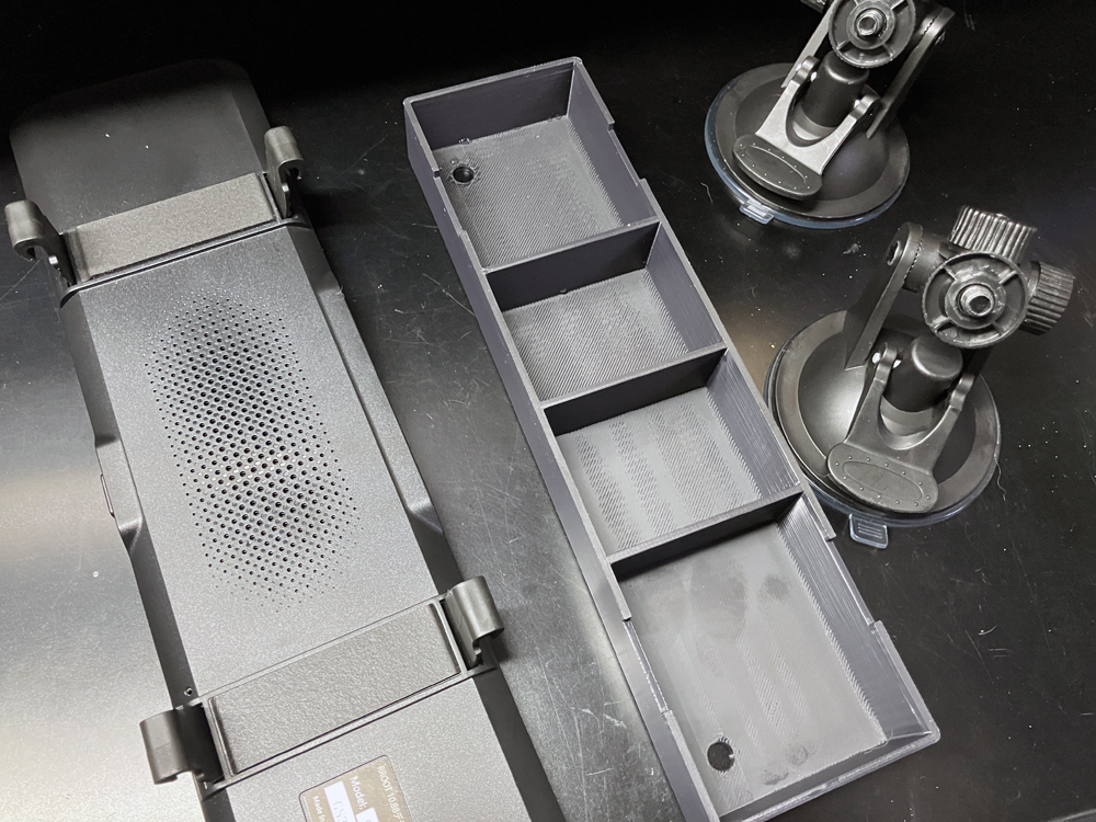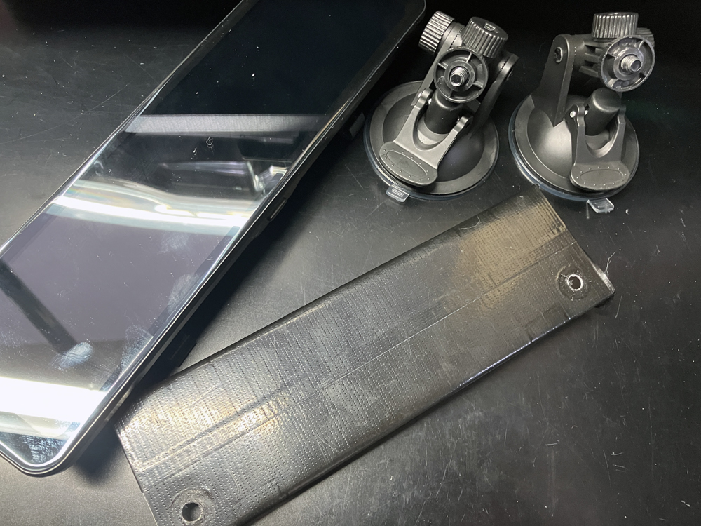 ドライブレコーダーに合わせて溝を入れ、中央3箇所に補強を入れました。素材はASA。一応Creality社のHP-ASAは耐熱温度114℃となっているので、夏場の車内でも大丈夫かと思います。