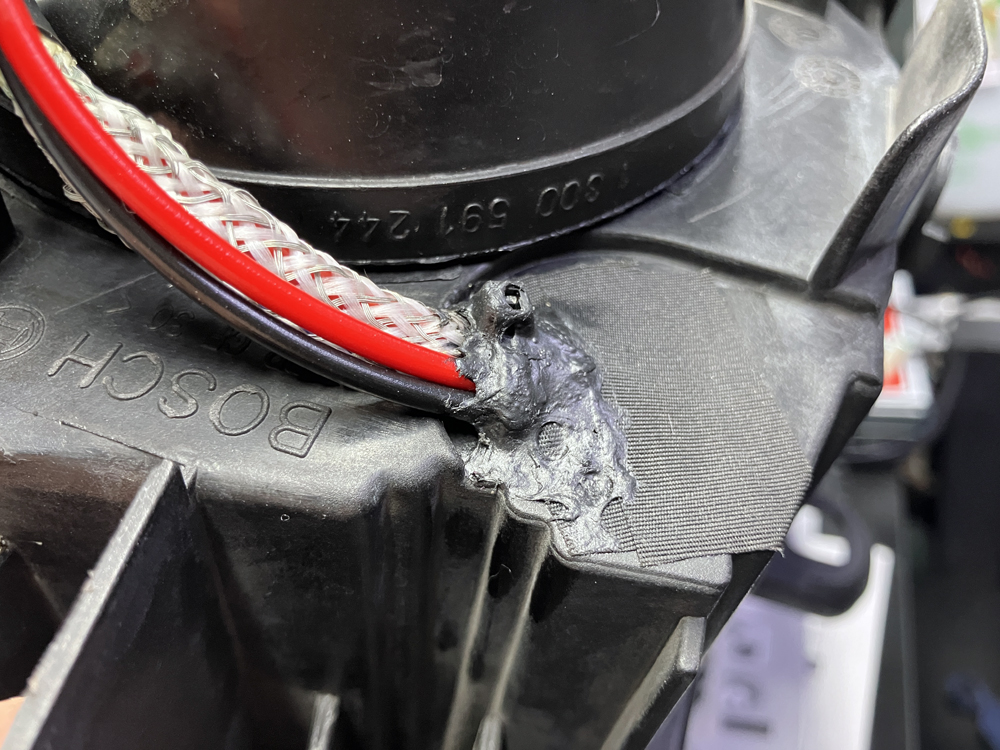 こちらの記事で洗車後にヘッドライトユニットが曇る原因を探りましたが、過去のブログを見返していると、この記事で新しいHIDユニットを組んだときにライトユニットを加工した配線部分から水が侵入してしまいそうな箇所を発見。