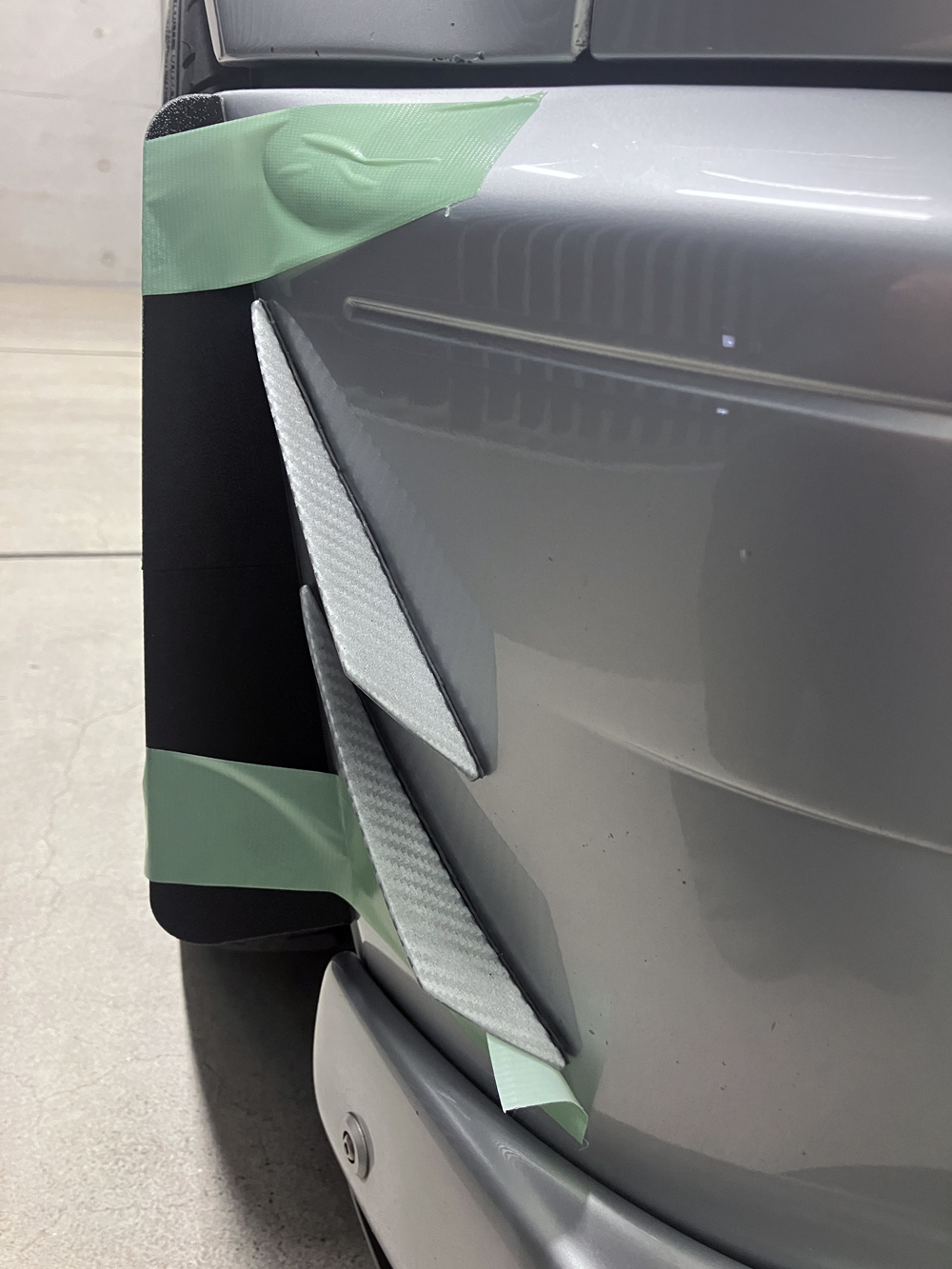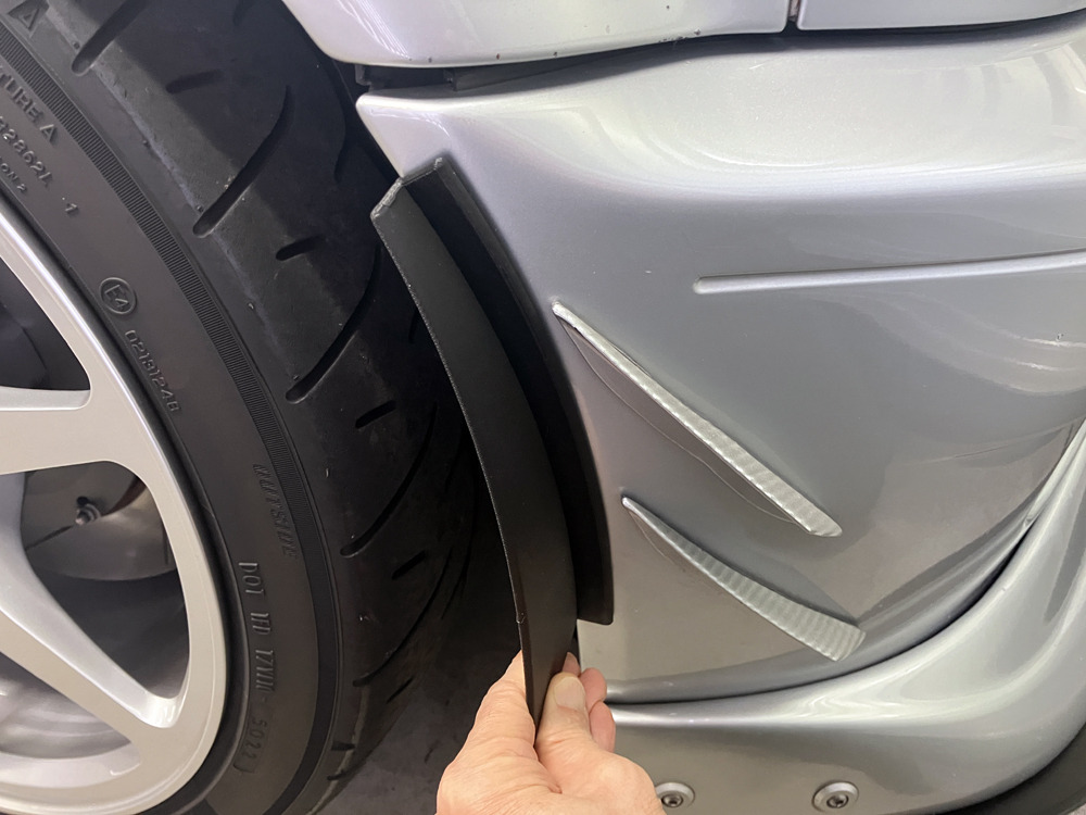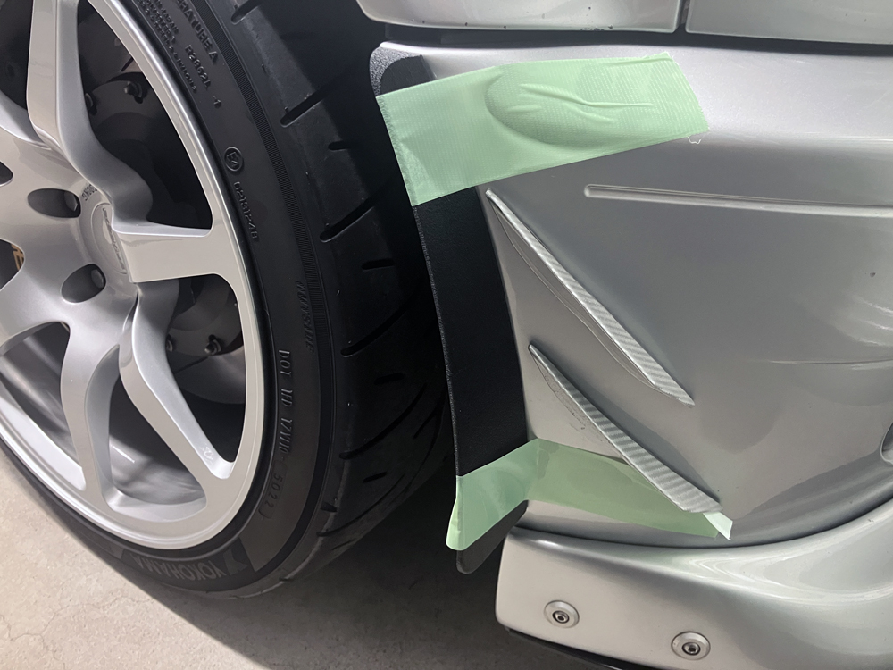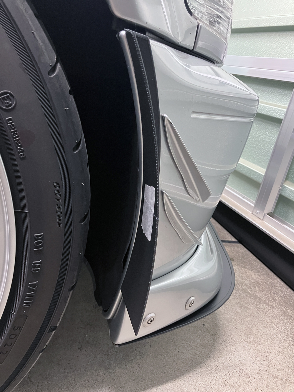 正面から見るとこんな感じ。上側が2cm、下が7cmぐらいの幅です。正面から見てタイヤに直接走行風が当たらないようにはなるかな?もう少ししっかりと覆った方がよいとは思いますが、既存エアロをそのままに簡易的に対策出来るように今回は作成を進めてみることにしました。