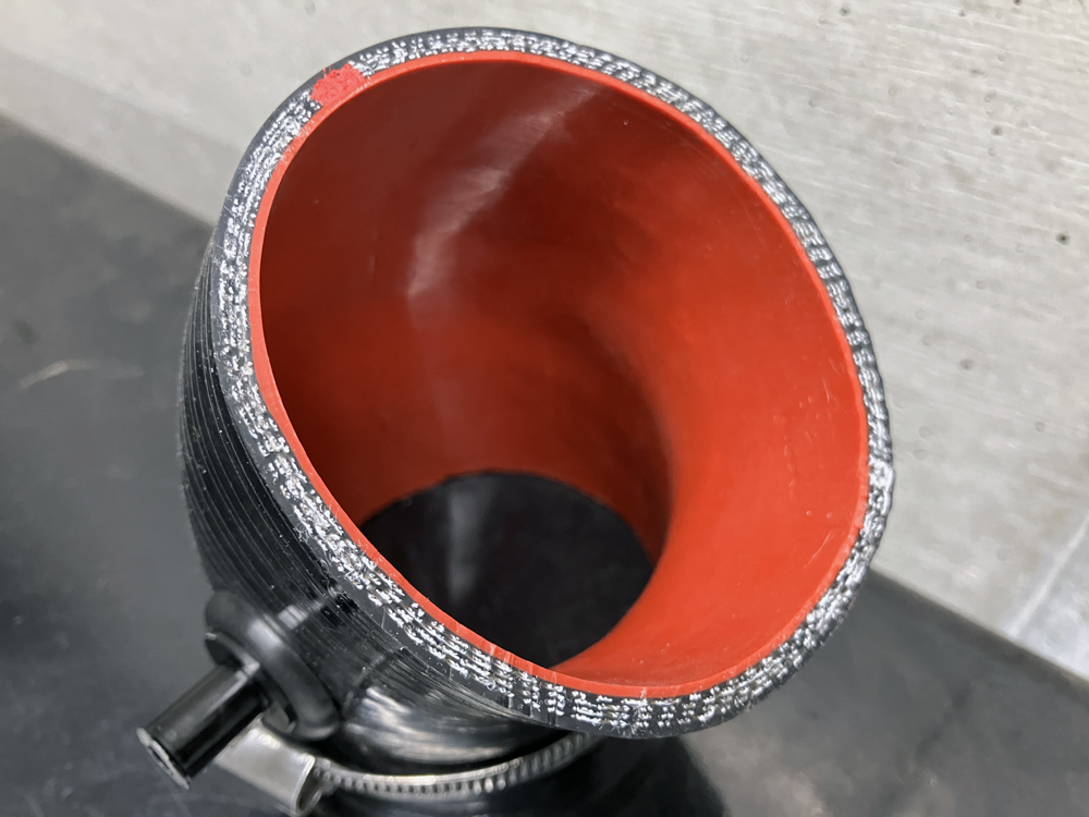 写真を見ていただくとわかりますがかなり焼けたような跡がはっきりわかりますね。Samco Sport 製の80mm、45度エルボー形状のものを使用してきましたが、今回は耐油性のあるよくわからないアマゾンで見つけたのでこちらの物を使用しました。