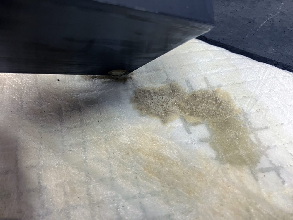 ブローバイチャンバーの表面温度は24℃ぐらいでした。この部分は走行風があたりやすいので冷えやすいためか内部にエマルジョン化した液体が溜まってしまうようです。本来はブローバイチャンバーにはクリーンなブローバイガス?!が通過するだけなんですけどね。