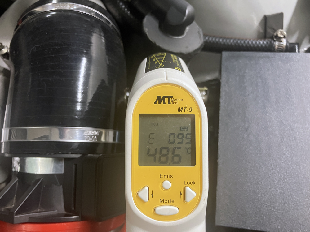 オイルセパレーターは50度近くまで上がってました。ここは冷却した方がよいのか悪いのか。E46M3などのブローバイセパレーターはエンジン熱でサイクロンセパレーターを温めるためにエンジンヘッドカバーの上部に設置してあります。急激に冷やすと水分が増えるてしまうための対策、そして凍結防止対策だと思いますけど。サイクロンセパレーターは冷やさない方がよいのかな?