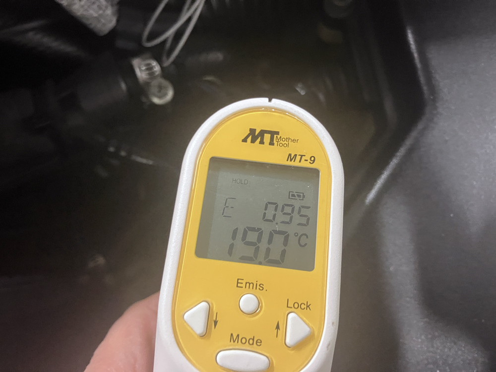 アルミオイルキャッチタンクの表面温度は19℃でした。これならオイルセパレーターから漏れたブローバイガスは十分冷やされますね。各所の温度は外気温度、走行時間で大きくかわると思いますが、各部の温度差が大体の目安になるかと思います。