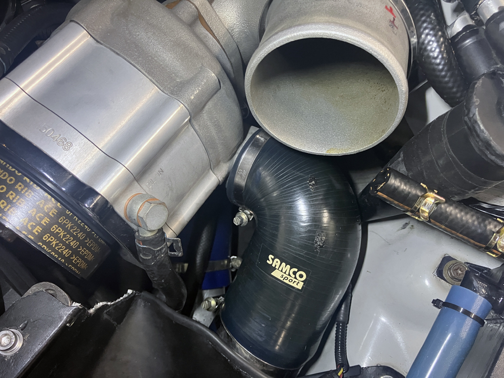 前回オイルが付着していたスーパーチャージャーアウト側のサクションパイプ付近の状態を確認。オイル付着は見られませんでした。こうして写真をみるとIN側のサクションパイプ内部にオイル付着がみられますね。