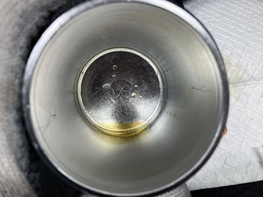 続いて今回作成したブローバイガスチャンバーのドレンボルトを取り外して内部に溜まった液体の排出。前回作成したブローバイガスチャンバーと大きな変化はなくエマルジョン化した液体が少量流れ出てくる感じです。ブローバイガスチャンバーのサイズによる差はあまり感じられませんが、容量は大きい方がブローバイガスが冷えやすく液化しやすかったと思いますが、大きな差は見られませんでした。