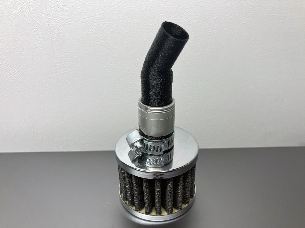 あとこちらはブローバイガスチャンバーに接続している2次エアフィルターのホース。エアフィルターの収まりが悪かったのでKTMのバックプレッシャーバルブ経とブローバイガスチャンバー側のニップルサイズに合わせて、TPU素材で30°エルボー形状でモデリングして作成。