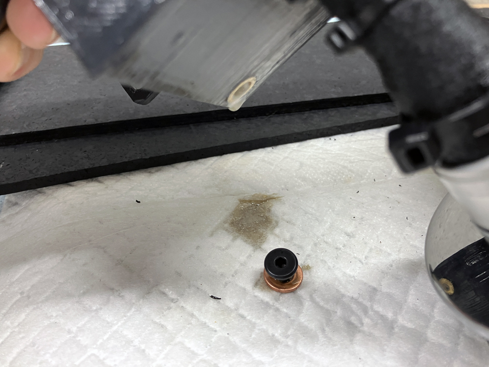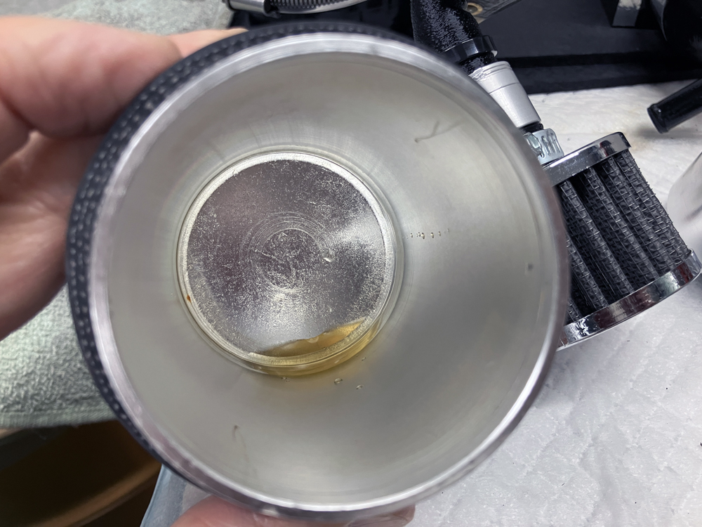 問題となっているブローバイガスチャンバーのドレンを開けて内部の状態。やはりエマルジョン化した液体が溜まってしまいました。ここには本当は何も溜まってほしくないんですけど、今回も大きな効果なし。ブローバイチャンバーは走行直後の確認で毎回このようにエマルジョン化した液体が出てくるので、かなり冷えていることがわかります。ちなみに年に一度程度のメンテンでこのぐらいの量ならば理想的だと思うけど...。