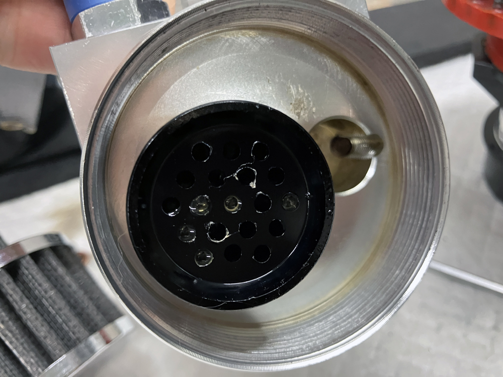 今回作成したオイルセパレーターのドレンに繋がるオイルキャッチタンク内部の状態。色付きの水ですね。走行直後はまだ温まった状態なので綺麗にみえますけどこれが冷えるとエマルジョン化してブローバイチャンバーから排出されたような液体(表現が好きじゃないですけどマヨネーズ化した液体)になります。