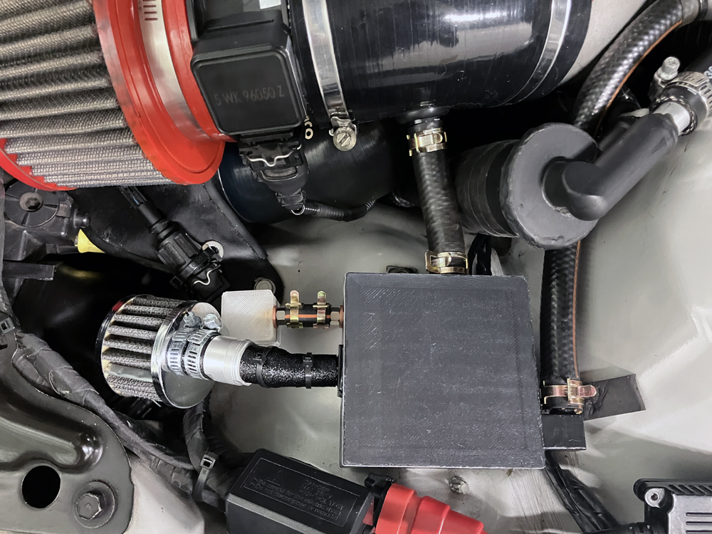 ブローバイチャンバー側とミニタンク側それぞれに装備して耐熱・耐油ホースで接続しました。