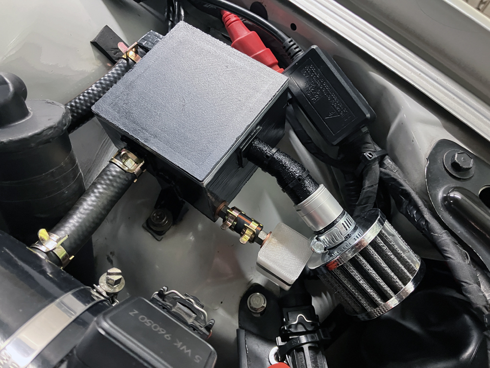 前回のこちらの記事で約355km走行しても数滴しかブローバイチャンバーから液体が排出されませんでしたので、かなり容量の小さなミニタンクをPET-G素材で作成。