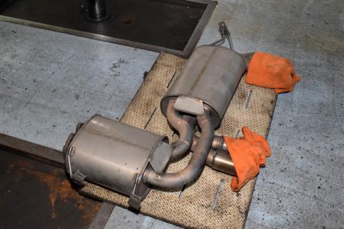 愚痴が長くなりましたが、横浜店での森メカに調べてもらったところ、原因はマフラーのリアピースの太鼓ということで、E46M3の貸し出し用純正マフラーが横浜店にあったので、アーキュレイさんに修理に出す間、お借りすることにしました。