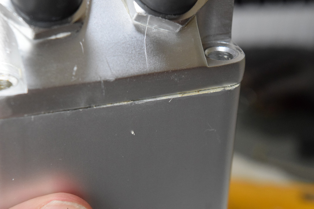 このVersion5のオイルキャッチタンクは、Version3の再利用のため、ガスケットリムーバーで洗浄し、さらにマジックリンで綺麗に洗浄後、かなりしっかりと液体ガスケットでシールしたつもりだったんですが、ご覧の有様です。