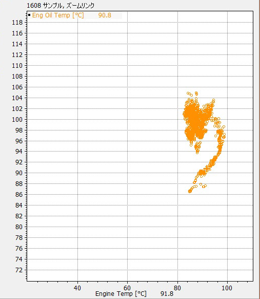 水温84~100℃に対して油温も同じ温度でマップされ(水温も油温も冷えた状態)、油温がある特定以上になると水温が80~90℃台に多くプロットされているので、油温を判定してサーモスタット付き電子弁ウォーターバルブの制御がマップに指定した通りうまく出来ている状態だと思われます。